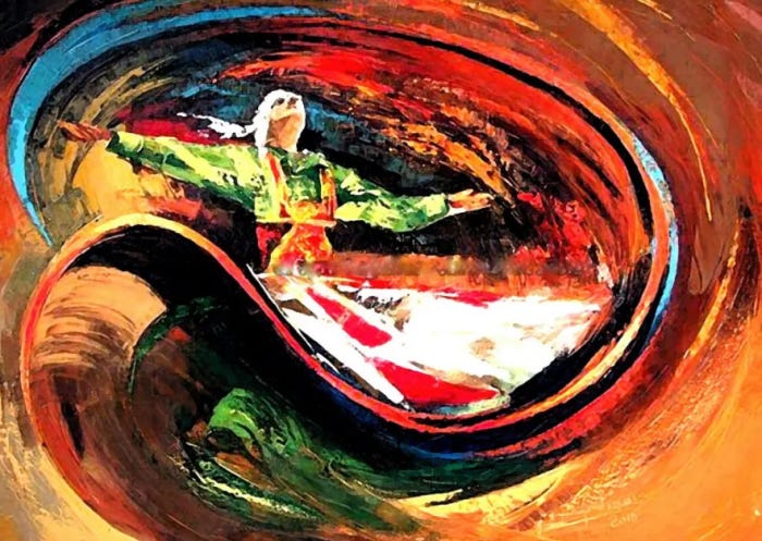 “Dance, especially the whirling dance, goes together with ecstasy, that state in which the seeker seems to be leaving the earthly centre of gravity to enter into another spiritual centre’s attracting power, as though he were joining the angelic hosts or the blessed souls”. [26]