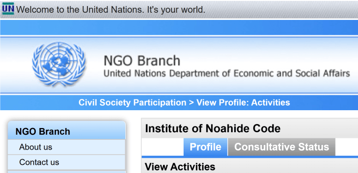 “The Institute of Noahide Code recruits parliamentarians from all United Nations member states who share the goal of implementing these United Nations resolutions into national legislation by providing model draft legislation, initiating workshops and conferences and creating alliances with religious leaders, media and academic leaders and business executives who support and supplement the legislation by teaching, publicizing and putting into practice the ‘global ethics’ inherent in these United Nations Resolutions.